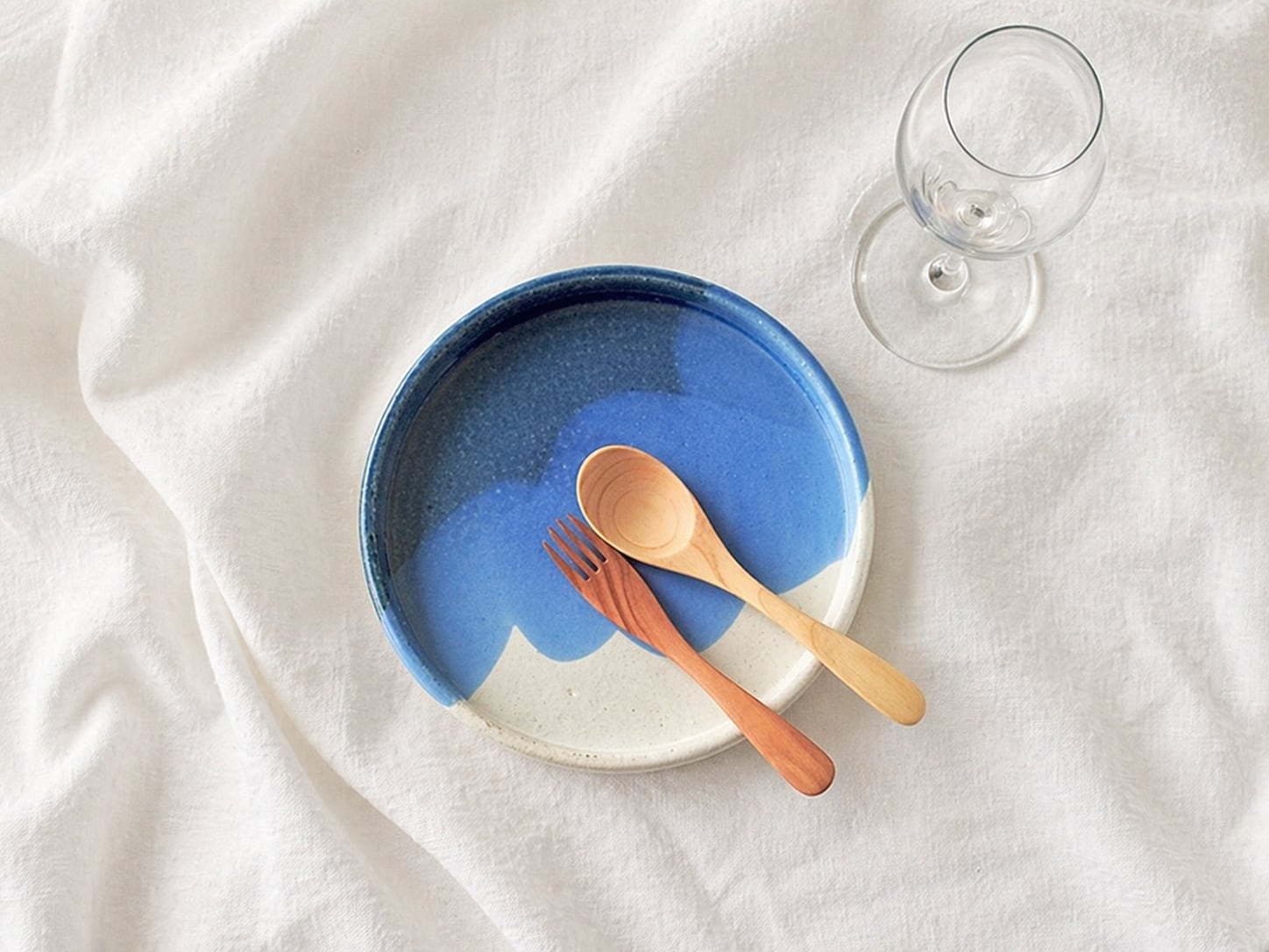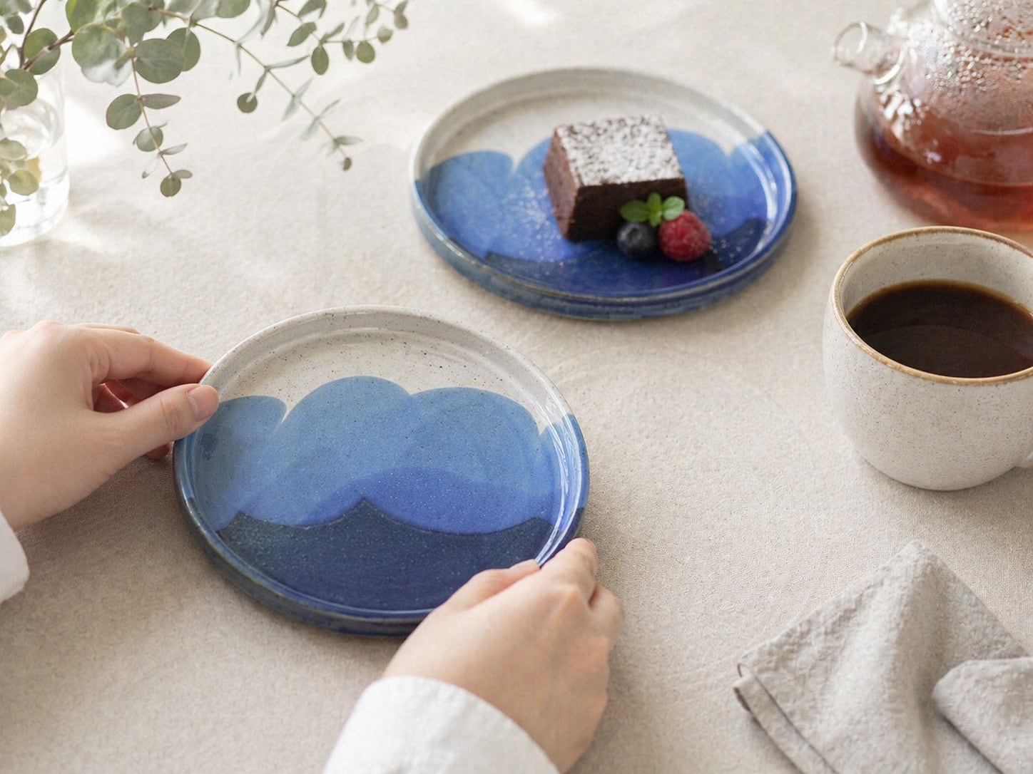 そんな穏やかな海辺の風景を、釉薬の流れ模様で表現した中皿サイズのフラットプレートです。